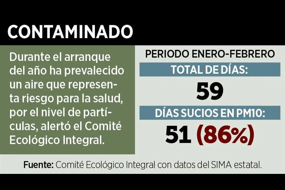 El panorama ambiental en la entidad ha alcanzado niveles verdaderamente tóxicos en lo que va del año. Según el reporte del Comité Ecológico Integral, de los 59 días transcurridos en el primer bimestre, 51 superaron los límites permitidos. Esto significa que los regios hemos pasado casi todo el tiempo bajo una nube de partículas PM10 dañinas.